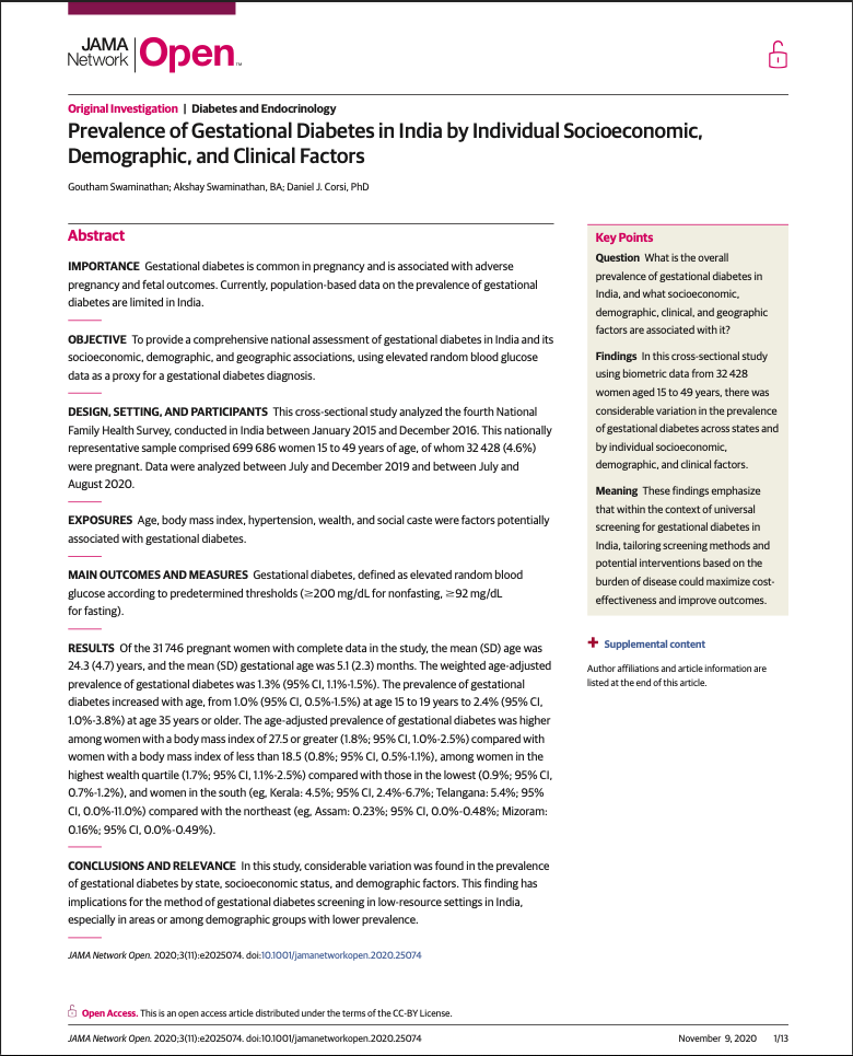 This was a paper that I co-authored with Epidemiologist Dr. Daniel J. Corsi of the CHEO Research Institute at the University of Ottawa. The paper was accepted by JAMA Network Open and published in November 2020. The paper provides a state-level overview of the prevalence of gestational diabetes, taken from the National Family Health Survey (NFHS) from Jan 2015 to Dec 2016. A multivariate logistic regression was conducted, controlling for socioeconomic, demographic, and clinical factors, to identify the strongest associations to increased/decreased prevalence of gestational diabetes.