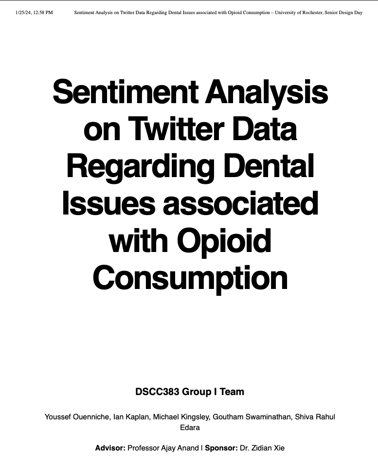 This is my senior capstone project, created by myself and my group partners, for our Data Science Senior Capstone class (in lieu of senior thesis). The purpose of the project was to use sentiment analysis on a dataset of raw tweets from Twitter to identify an association between self-reporting of dental issues and self-reporting of opioid consumption. We utilized a BERT model and corpi of keywords for dental issues and opioid consumption, known as medication-assisted treatment (MAT) keywords. Our separation between training data and testing data was based on the publication date of the tweets and the release of a warning by the FDA related to the development of dental issues due to opioid use disorder (OUD). Our project was developed and executed over the 2022-2023 academic year, with feedback and guidance from Dr. Zidian Xie and Dr. Ajay Anand. Our results were presented in front of the class during Presentation Week and was also highlighted during the Senior Design Day hosted by the Goergen Institute for Data Science at the University of Rochester Hajim School of Engineering.